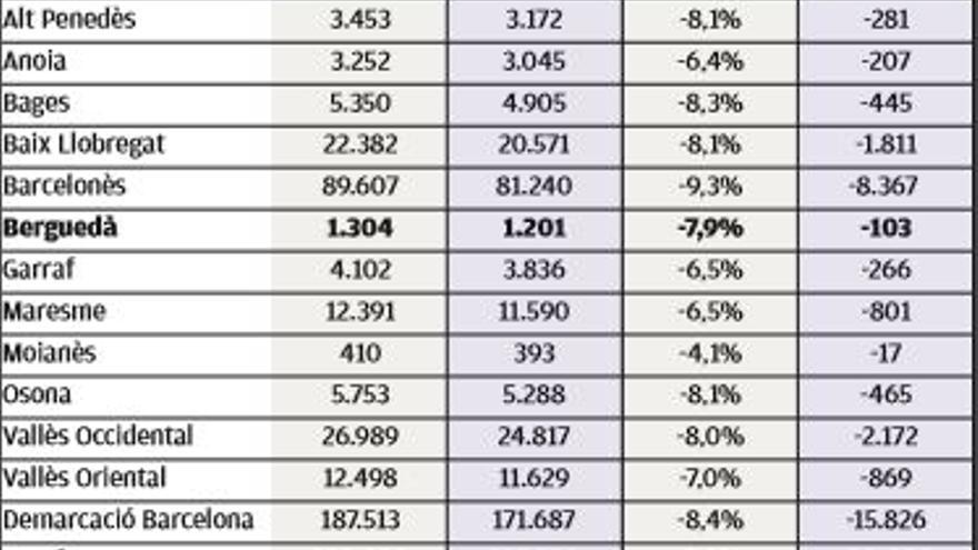 El Berguedà es va situar en el mateix registre que la mitjana catalana (-7,9%), mentre que l’Anoia (-6,4%) i el Moianès (-4,1%) van experimentar davallades inferiors a la mitjana nacional. De fet, el Moianès va ser la comarca de la demarcació barcelonina amb la pèrdua percentual menor d’empreses.