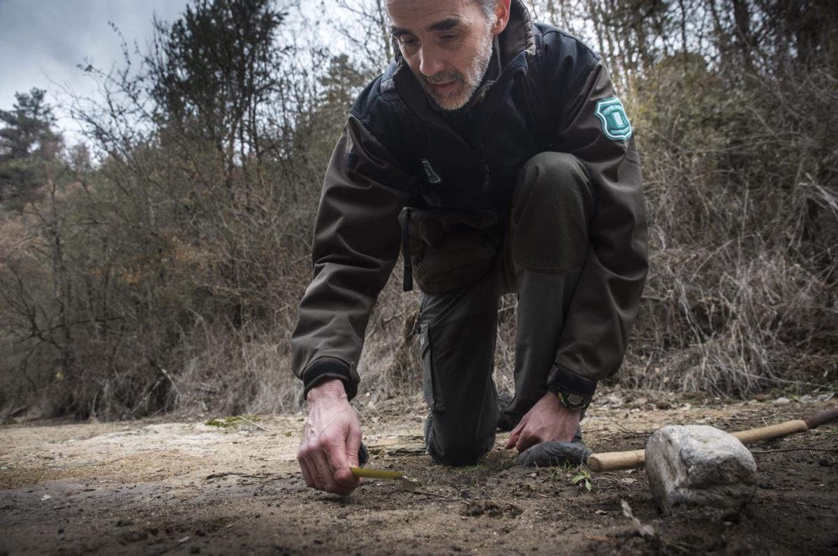 Gabriel lampreave, fent tasques de seguiment de rastres de llop al Moianès, el 2023 / ARXIU/OSCAR BAYONA