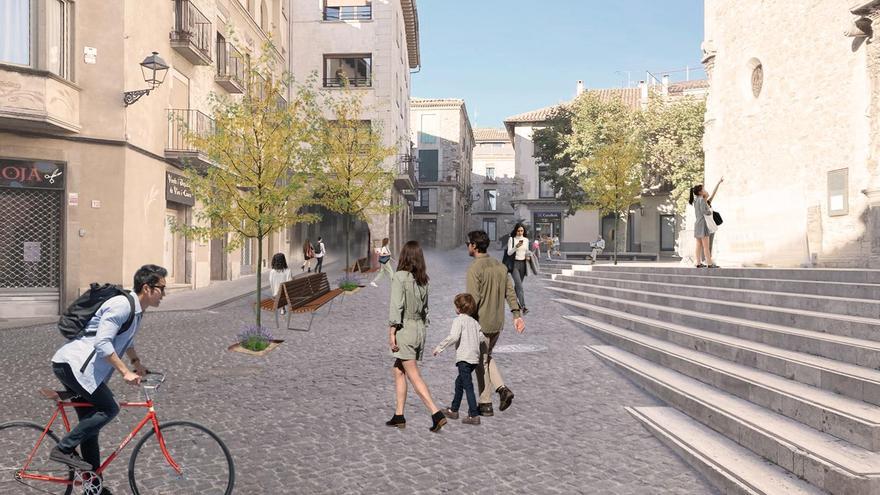 Per una banda, es vol ordenar els espais i els accessos del centre històric. En aquest punt s’inclou una nova proposta d’ubicació de terrasses d’establiments de restauració, que guanyaran espai amb l’eliminació dels contenidors soterrats. També es vol dinamitzar socialment i econòmicament la plaça i millorar-ne les prestacions com a lloc d’estada i apte per al joc, per exemple amb la col·locació d’una pissarra per als infants.